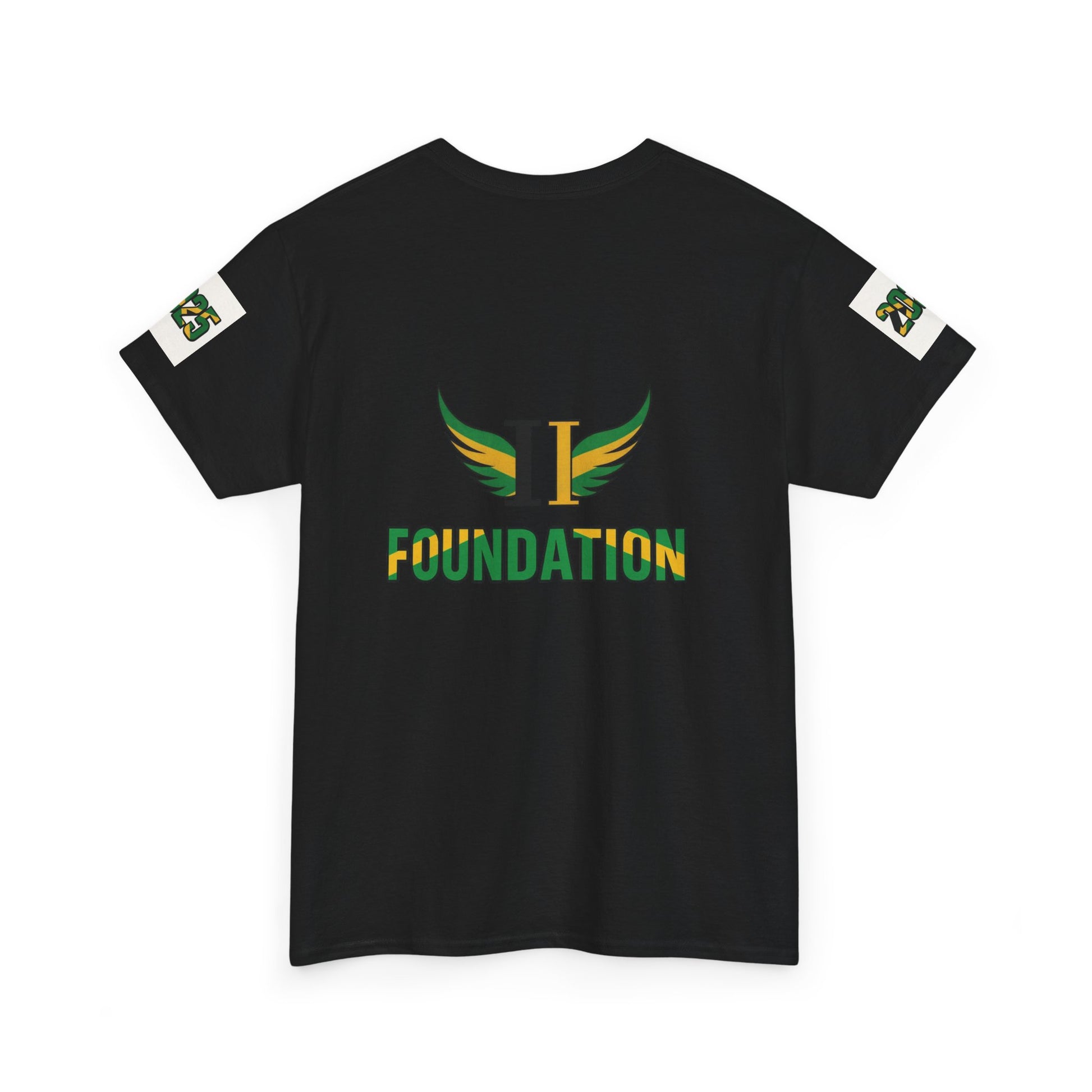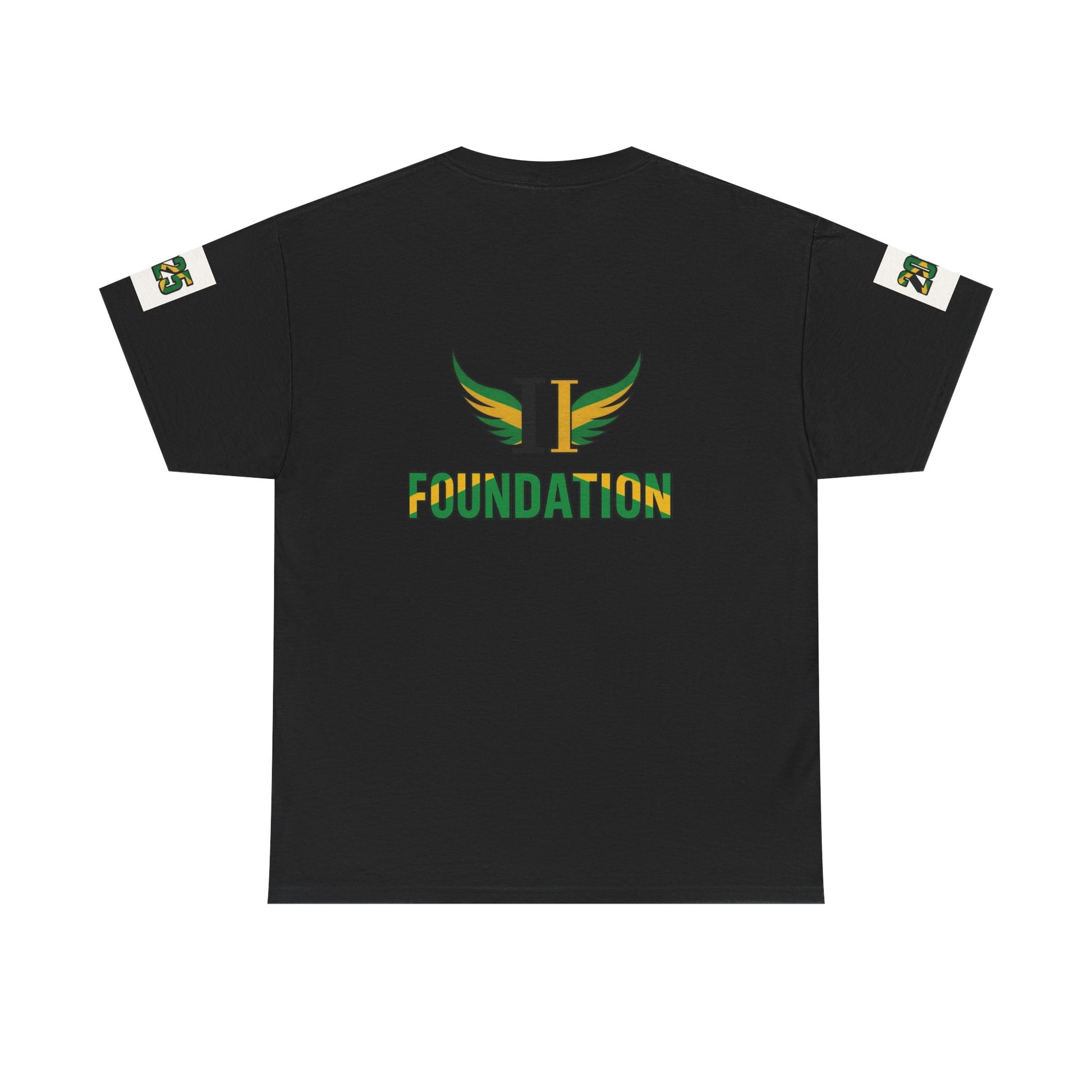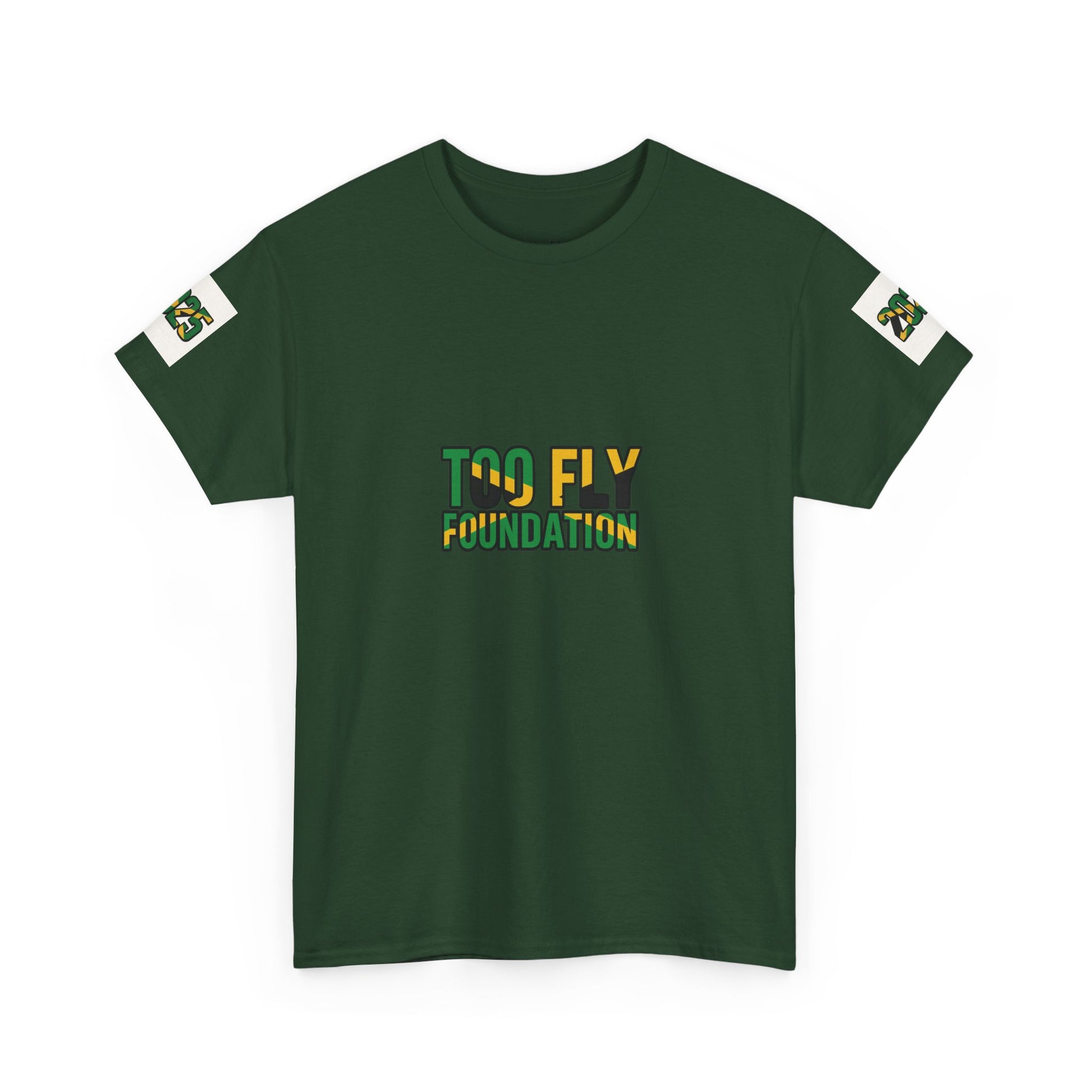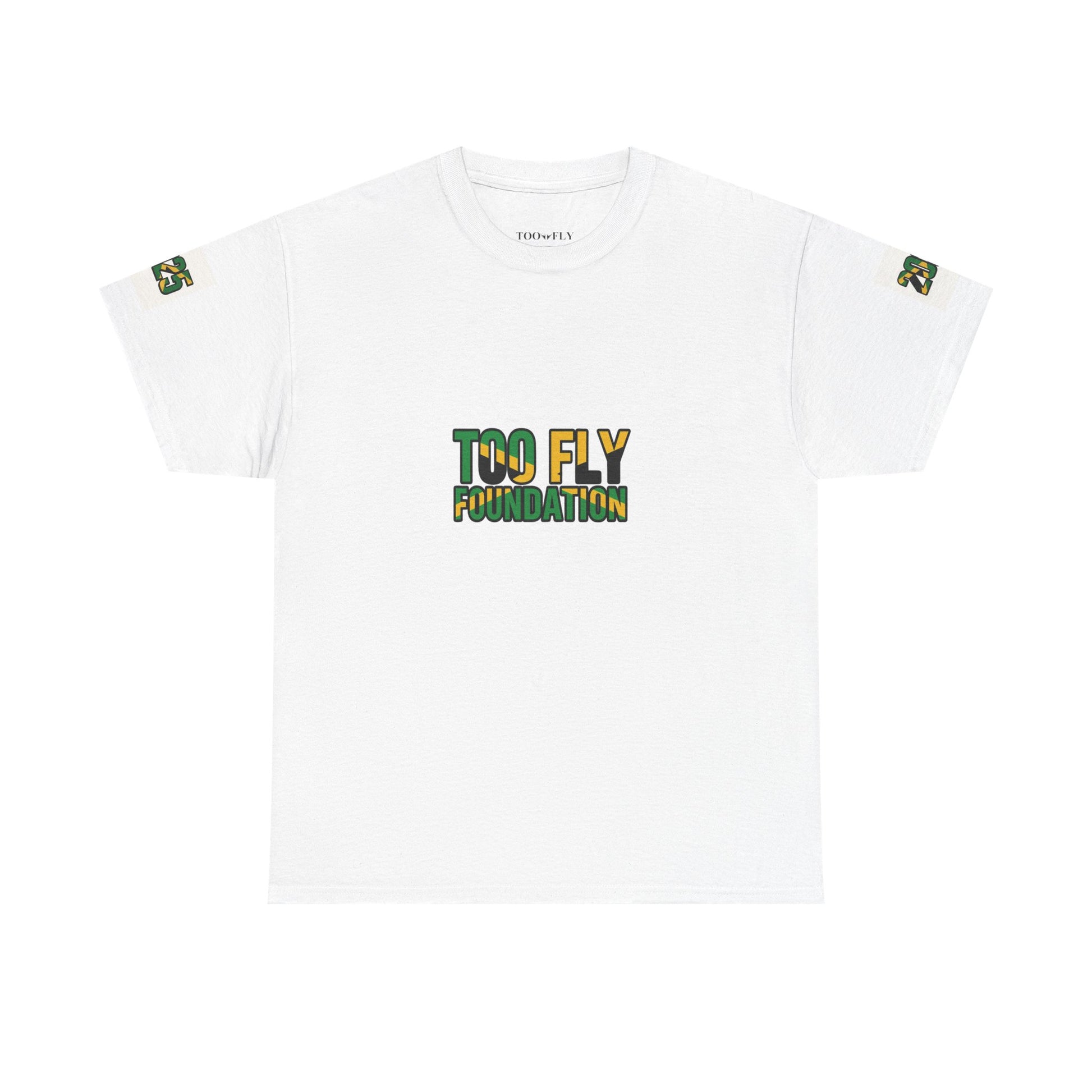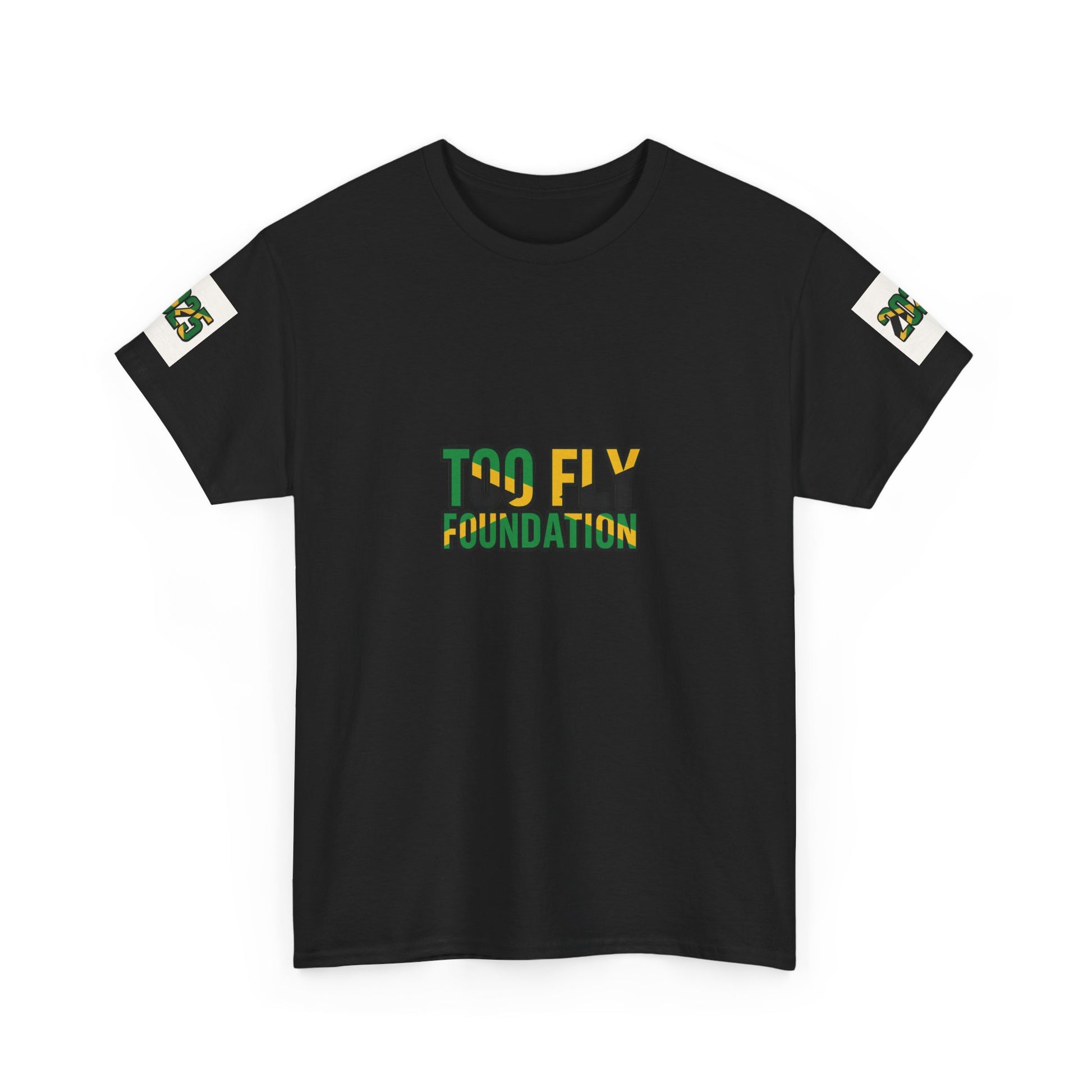 Too Fly Foundation T-Shirt – Black- Gold-Green Edition. Each purchase a percentage is donated to the Too Fly Foundation to support the damaged by Hurricane Melissa in Jamaica.